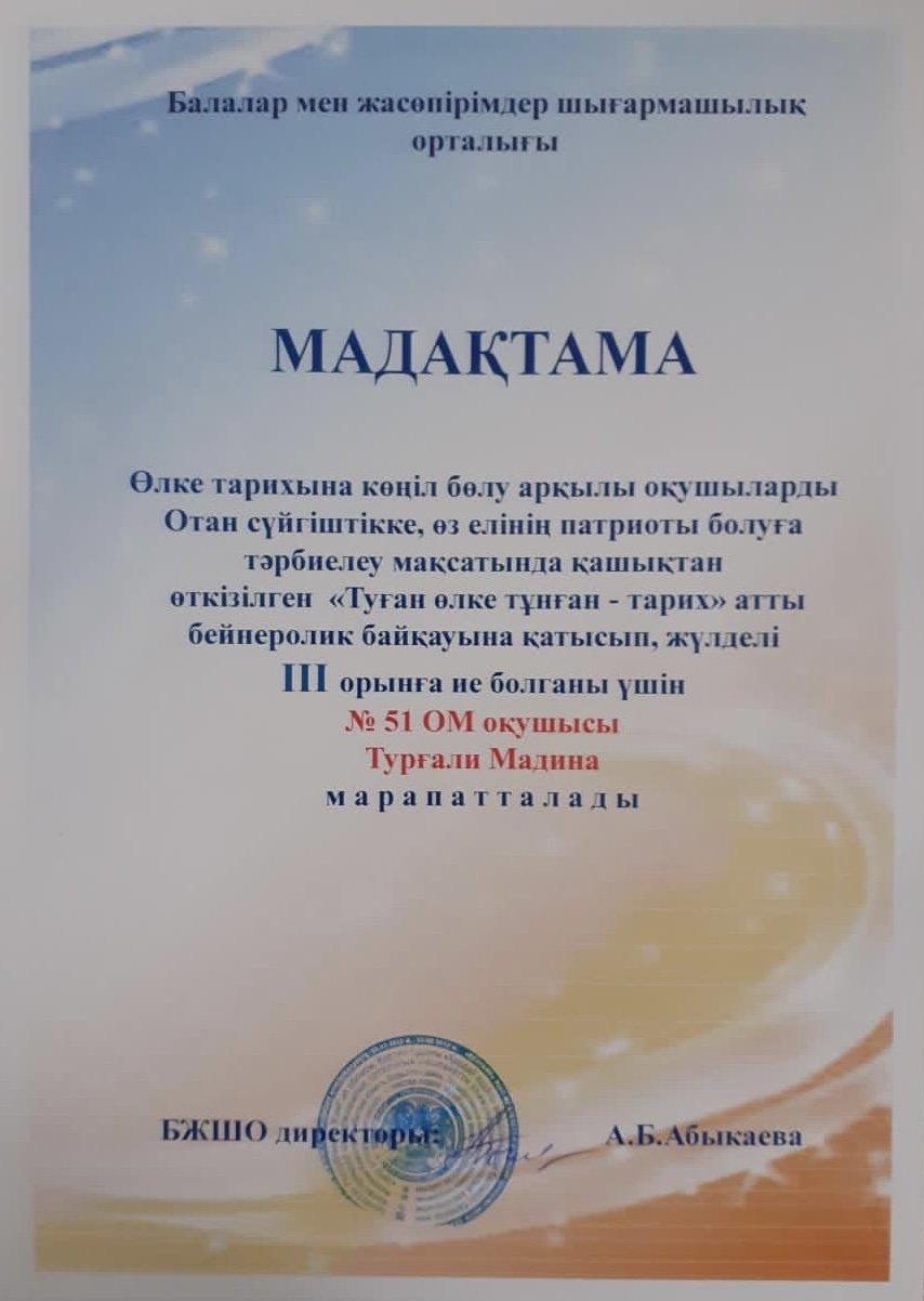 "ІІІ орын" - Тұрғали Мадина 9 "Ә" сынып