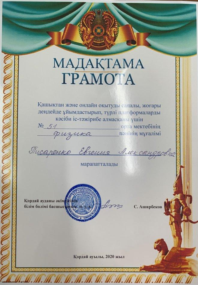 Қашықтан және онлайн оқытуды сапалы, жоғары деңгейде ұйымдастырып, түрлі платформаларды кәсіби іс-тәжірибе алмасқаны үшін №51 орта мектебінің физика пәнінің мұғалімі Писаренко Евгения Александровна Қордай ауданы әкімдігінің білім бөлімі басшысының мадақтамасымен марапатталды.