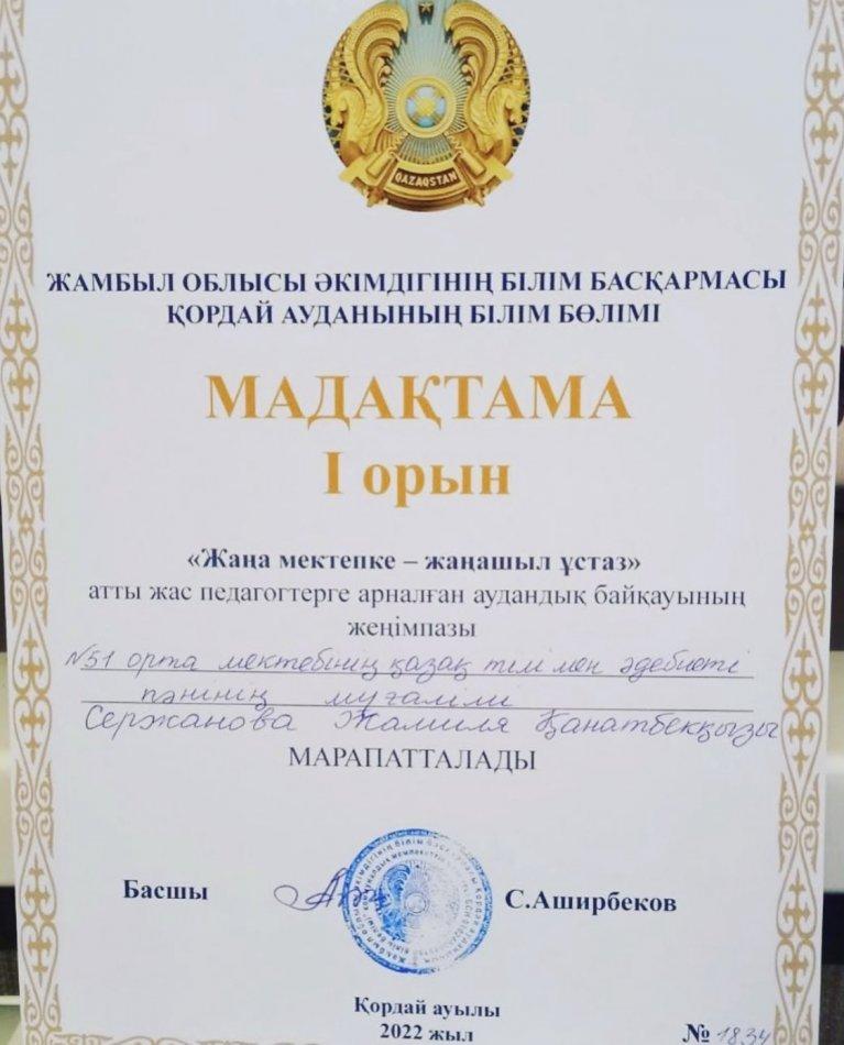 "Жаңа мектепке - жаңашыл ұстаз" атты жас педагогтерге арналған аудандық байқауының жеңімпазы, І орын иегері №51 орта мектебінің қазақ тілі мен әдебиеті пәнінің мұғалімі, жас маман Сержанова Жамиля Қанатбекқызы.