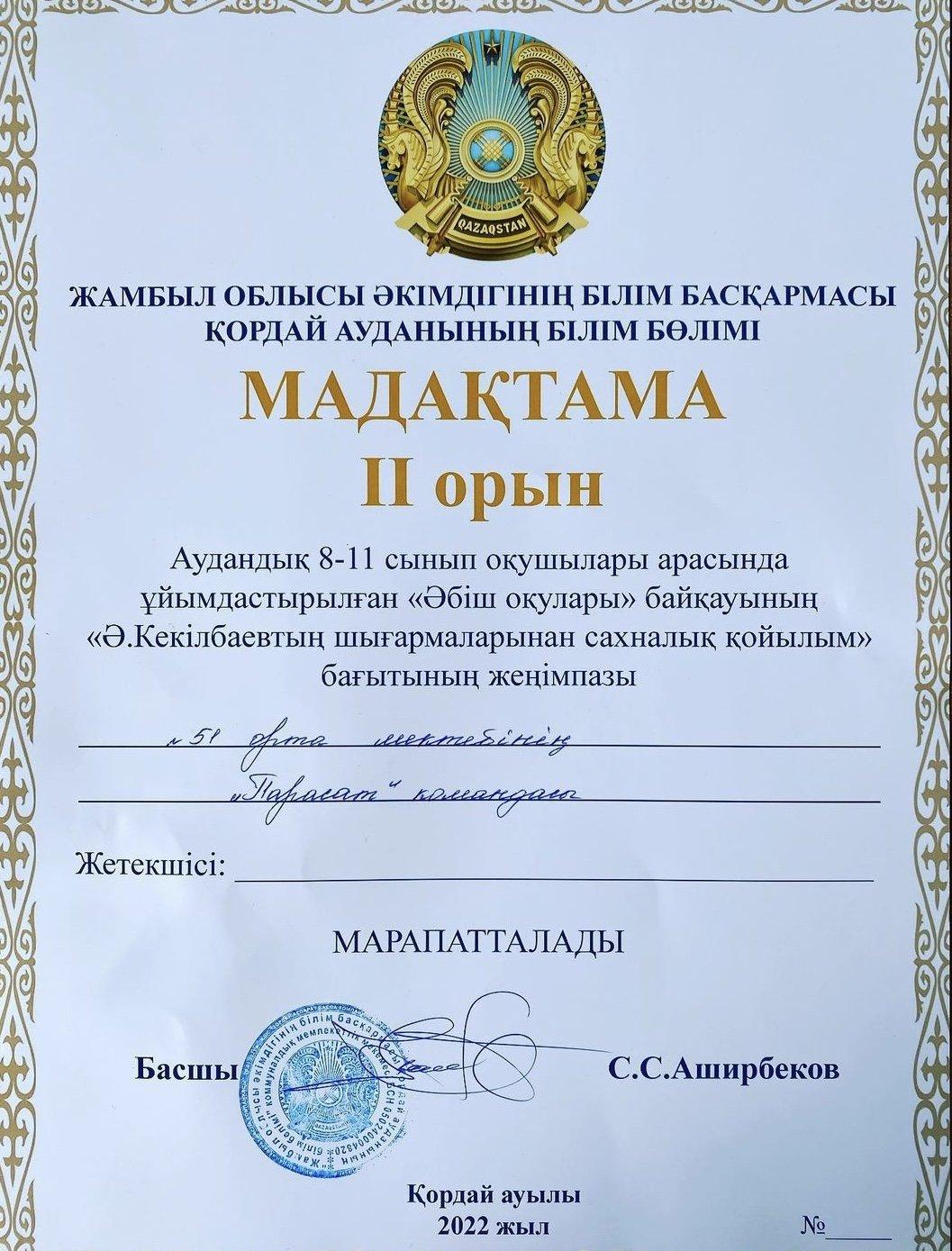 Аудандық 8-11 сынып оқушылары арасында ұйымдастырылған "Әбіш оқулары" байқауының "Әбіш Кекілбаевтың шығармаларынан сахналық қойылым" бағытының жеңімпазы, ІІ орын иегері №51 орта мектебінің "Парасат" командасы. Жетекшісі: қазақ тілі мен әдебиеті пәнінің мұғалімі Тлеубаева Айнагүл Аманғалиқызы.