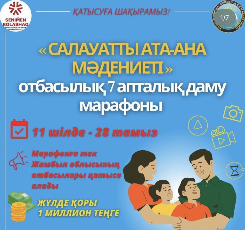 Жамбыл облысы әкімдігі білім басқармасы мен Республикалық "Сенімен Болашақ" ата-аналар қоғамдық бірлестігінің ұйымдастыруымен "Салауатты Болашақ" ата-аналар қоғамдық бірлестігінің ұйымдастыруымен "Салауатты ата-ана мәдениеті" марафоны өткізіледі. Марафон 11 шілде мен 28 тамыз аралығында өтеді. Марафонға қатысуға шақырамыз!