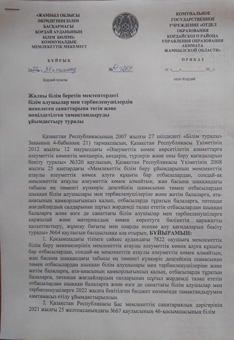 Жалпы білім беретін мектептердегі білім алушылар мен тәрбиеленушілердің жекелеген санаттарына тегін және жеңілдетілген тамақтандыруды ұйымдастыру туралы бұйрық