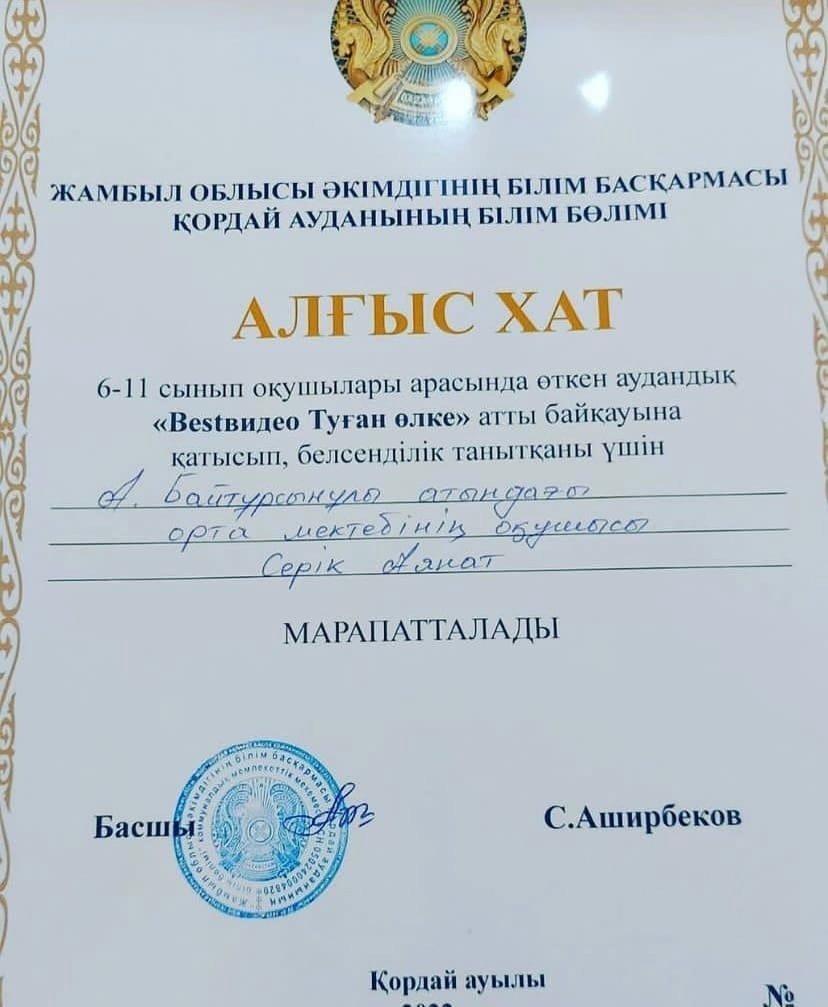 Ахмет Байтұрсынұлы атындағы орта мектебінің 8 "А" сынып оқушысы Серік Аянат 6-11 сынып оқушылары арасында өткен аудандық "Bestвидео Туған өлке" атты байқауына қатысып, белсенділік танытқаны үшін Қордай ауданы білім бөлімінің Алғыс хатымен марапатталды.