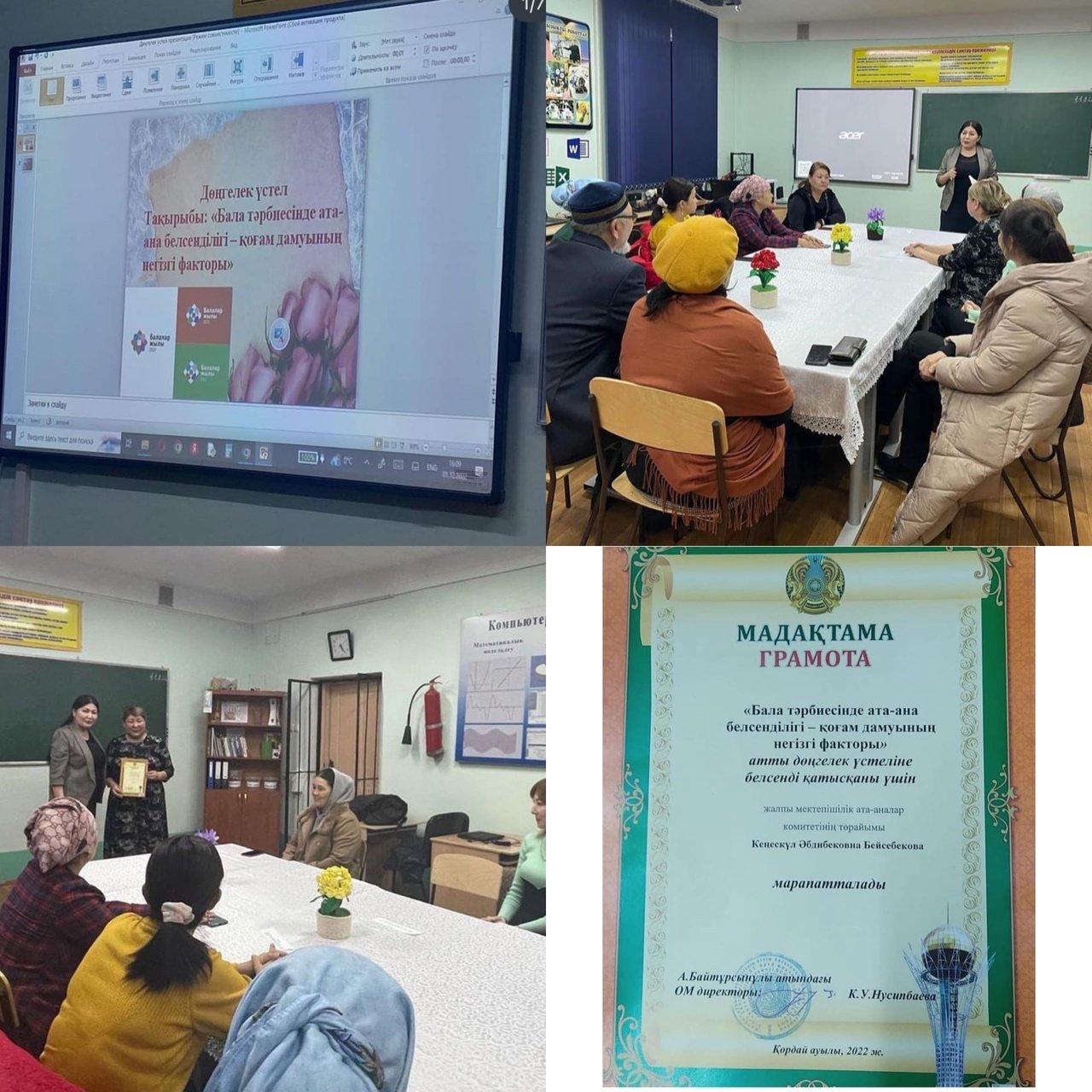 Директордың құқықтық тәрбие ісі жөніндегі орынбасары М.Т. Абдрасилованың ұйымдастыруымен ата-аналарға арналған "Бала тәрбиесінде ата-ана белсенділігі-қоғам дамуының негізгі факторы" атты дөңгелек үстелі өтті. Дөңгелек үстел аудандық әкелер кеңесінің төрағасы Б.О.Байжігітов, жалпы мектепішілік ата-аналар комитетінің төрайымы К.Ә. Бейсебекова және мектеп психологы М.С.Абуеваның қатысуымен өтті. Дөңгелек үстелдің аяғында іс-шараға белсенді қатысқаны үшін К.Ә.Бейсебекова мектеп директорының мадақтамасымен марапатталды.