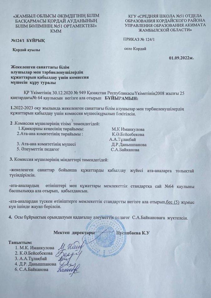 01 сентябрь 2022 0 1 2 3 4 5 Жекеленген санаттағы білім алушылар мен тәрбиеленушілердің құжаттарын қабылдау үшін комиссия мүшесін құру туралы