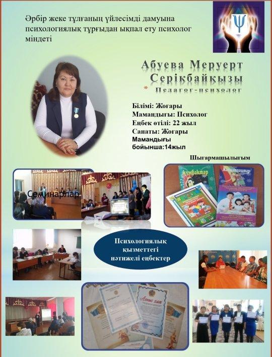 2017 жылы Қазақстан Республикасы Білім және Ғылым Министрлігі Біліктілікті арттырудың Қ азақстандық өңіраралық орталығы. «Мектептегі психологиялық қызмет жұмысын ұйымдастыру ерекшеліктері. Алматы қаласы.