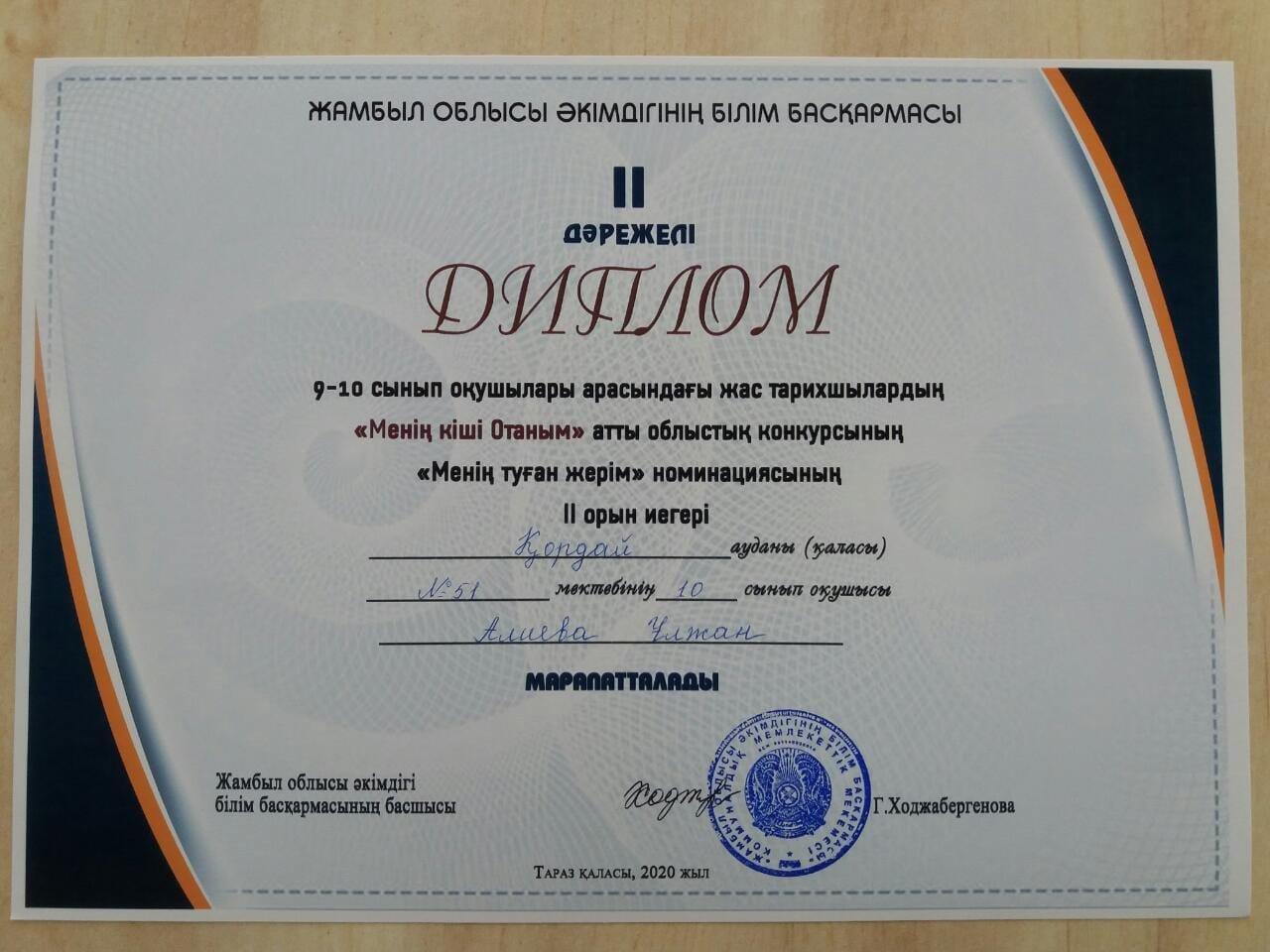 2-14 қазан аралығында жас тарихшылардың «Менің кіші Отаным» атты ІІІ Республикалық интеллектуалдық байқауы өткізілді. Аталған байқауға мектебіміздің 10 «А» сынып оқушысы Алиева Ұлжан қатысып, аудан бойынша І орынды иеленіп, облыстық деңгейде «Менің туған жерім» номинациясы бойынша ІІ дәрежелі Дипломмен марапатталды.