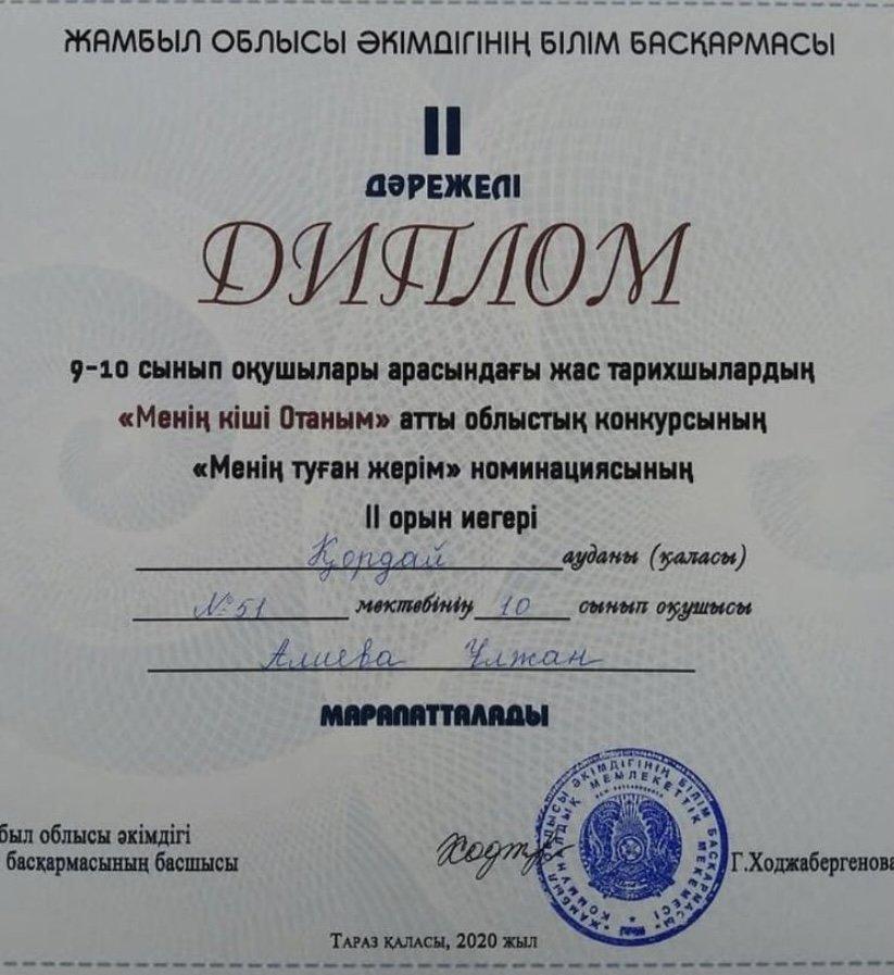 Жамбыл облысы Қордай ауданы №51 орта мектептің тарих пәнінің мұғалімі Тынысбай Бақытгүл Әріпбекқызы жеткіншек ұрпаққа білім беру мен тәрбиелеуді заман талабына сай шығармашылықпен жүргізуге баса мән беріп, оқушылармен жұмыс істеп жүрген ұстаз. Тарих магистрі. Осы шығармашылығының арқасында оқушылары түрлі ғылыми жобалар байқауларынан жоғары жетістіктерге жетіп жүргені белгілі. Атап айтсақ: - Сансызбай Бекзат «Менің кіші Отаным» атты конкурсының «Менің туған жерімнің символы» номинациясы бойынша: ауданнан – Бас жүлде иегері; облыстан – Бас жүлде иегері; Республикалық конкурстан – «Дарын» Республикалық ғылыми-орталығының грамота иегері; - Сансызбай Бекзат «Заманауи әлемдегі ғылым мен инновацияны дамытудағы жастардың рөлі» атты ІІ Халықаралық ғылыми жұмыстар және ғылыми жобалар байқауынан – ІІ орын иегері; - Алиева Ұлжан «Дарын» Республикалық ғылыми-орталығы ІІ дәрежелі диплом; - Алиева Ұлжан «Менің кіші Отаным» атты конкурсының «Менің туған жерім» номинациясы бойынша: ауданнан – І орын иегері; облыстан – ІІ орын иегері.