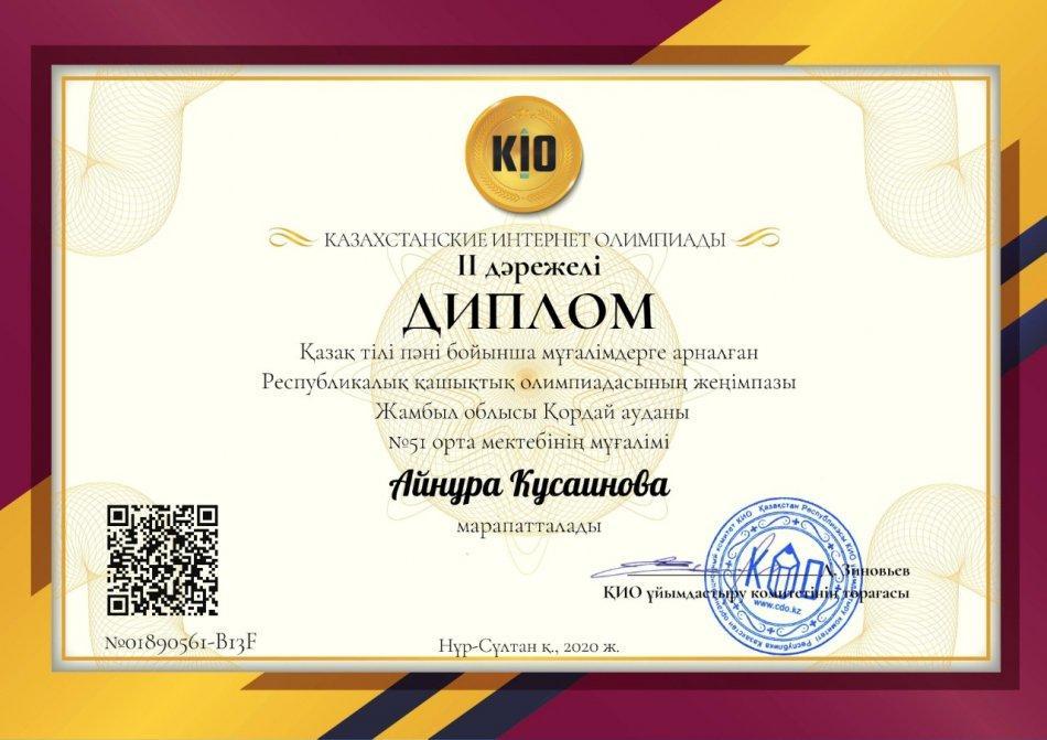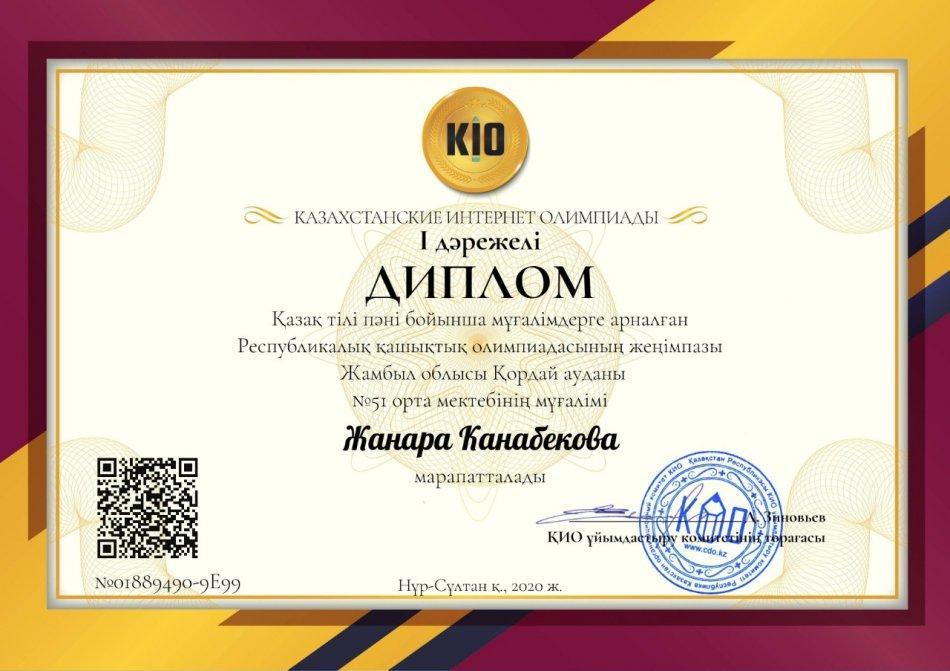 Қазақ тілі пәні бойынша мұғалімдерге арналған Республикалық қашықтық олимпиадасының жеңімпазы Жамбыл облысы Қордай ауданы №51 орта мектебінің мұғалімдері - Кусаинова Айнура Турысбековна - ІІ дәрежелі дипломмен, Канабекова Жанара - І дәрежелі дипломмен марапатталды.