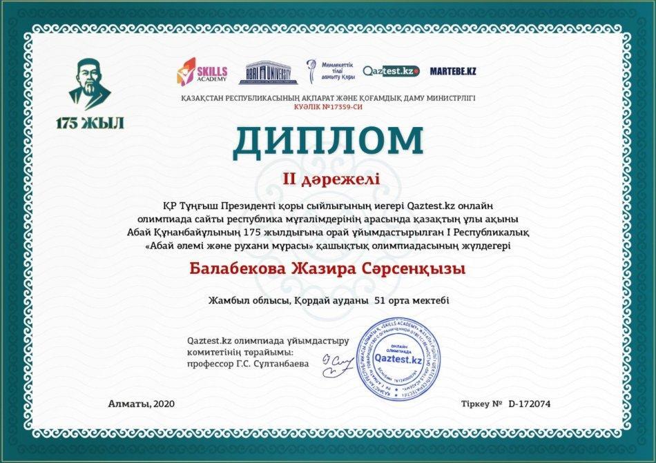ҚР Тұңғыш Президенті қоры сыйлығының иегері Qaztest.kz онлайн олимпиада сайты Республика мұғалімдерінің арасында қазақтың ұлы ақыны Абай Құнанбайұлының 175 жылдығына орай ұйымдастырылған І Республикалық "Абай әлемі және рухани мұрасы" қашықтық олимпиадасының жүлдегері №51 ОМ ұстазы Балабекова Жазира Сәрсенқызы ІІ дәрежелі дипломмен марапатталды.
