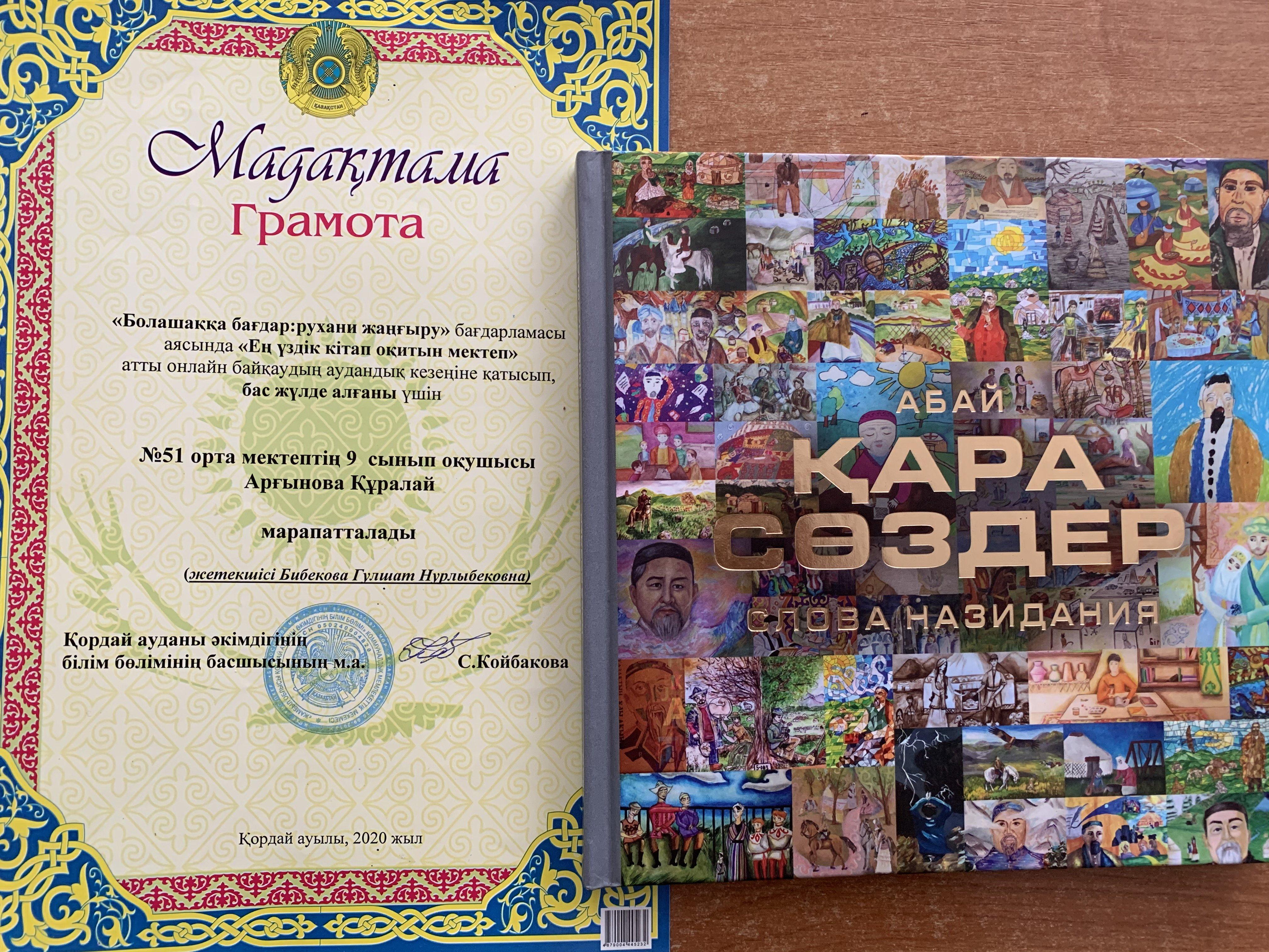 "Болашаққа бағдар: рухани жаңғыру" бағдарламасы аясында "Ең үздік кітап оқитын мектеп" атты онлайн байқаудың аудандық кезеңіне қатысқан №51 ОМ 9 сынып оқушысы Арғынова Құралай "Бас жүлдеге" ие болып, облысқа жолдама алды. Облыстық кезеңге қатысып, жүлделі ІІ орынға ие болды. Жетекшісі: Бибекова Гүлшат Нурлыбековна
