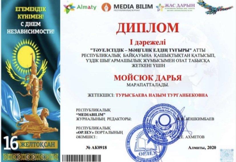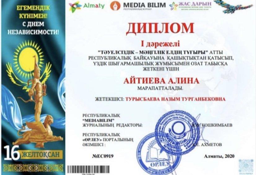 "Тәуелсіздік - мәңгілік елдің тұғыры" атты Республикалық байқауына қашықтықтан қатысып, үздік шығармашылық жұмысымен озат табысқа жеткені үшін, №51 орта мектеп оқушылары Мойсюк Дарья(І орын) және Айтиева Алина(І орын) иеленді.Байқау жетекшісі: Турысбаева Назым Турганбековна.