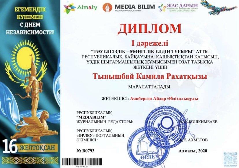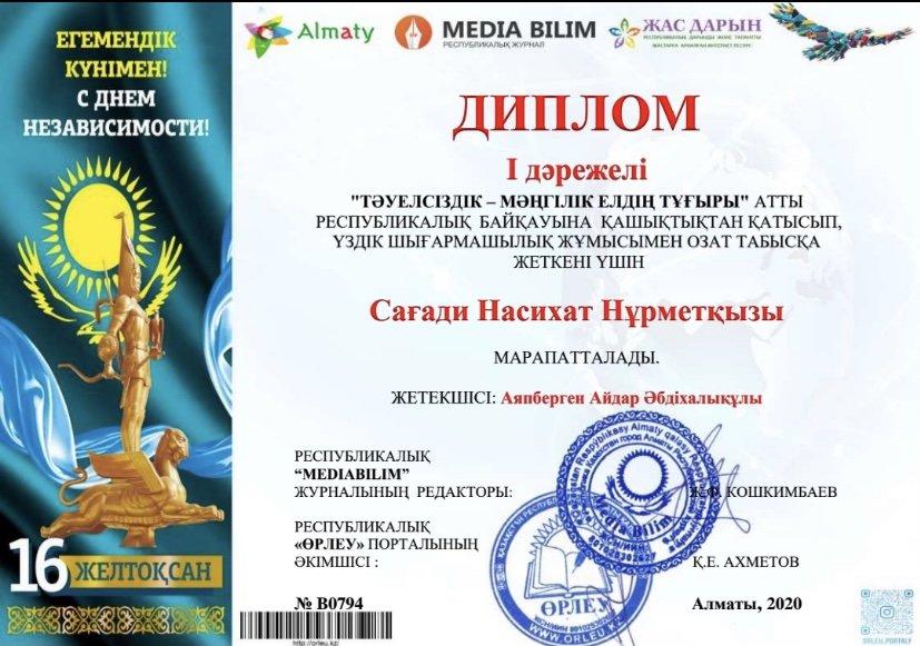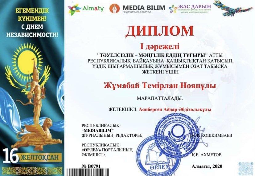 "Тәуелсіздік - мәңгілік елдің тұғыры" атты Республикалық байқауына қашықтықтан қатысып, үздік шығармашылық жұмысымен озат табысқа жеткені үшін №51 орта мектеп оқушылары Жұмабай Темірлан(І дәрежелі), Болат Кәусар(І дәрежелі), Тынышбай Камила(І дәрежелі), Сағади Насихат(І дәрежелі), Жарас Айым(І дәрежелі), Тажикова Сания(І дәрежелі), Махұлжан Нұрия(І дәрежелі) дипломмен марапатталды.Байқау жетекшісі: Аяпберген Айдар Әбдіхалықұлы.