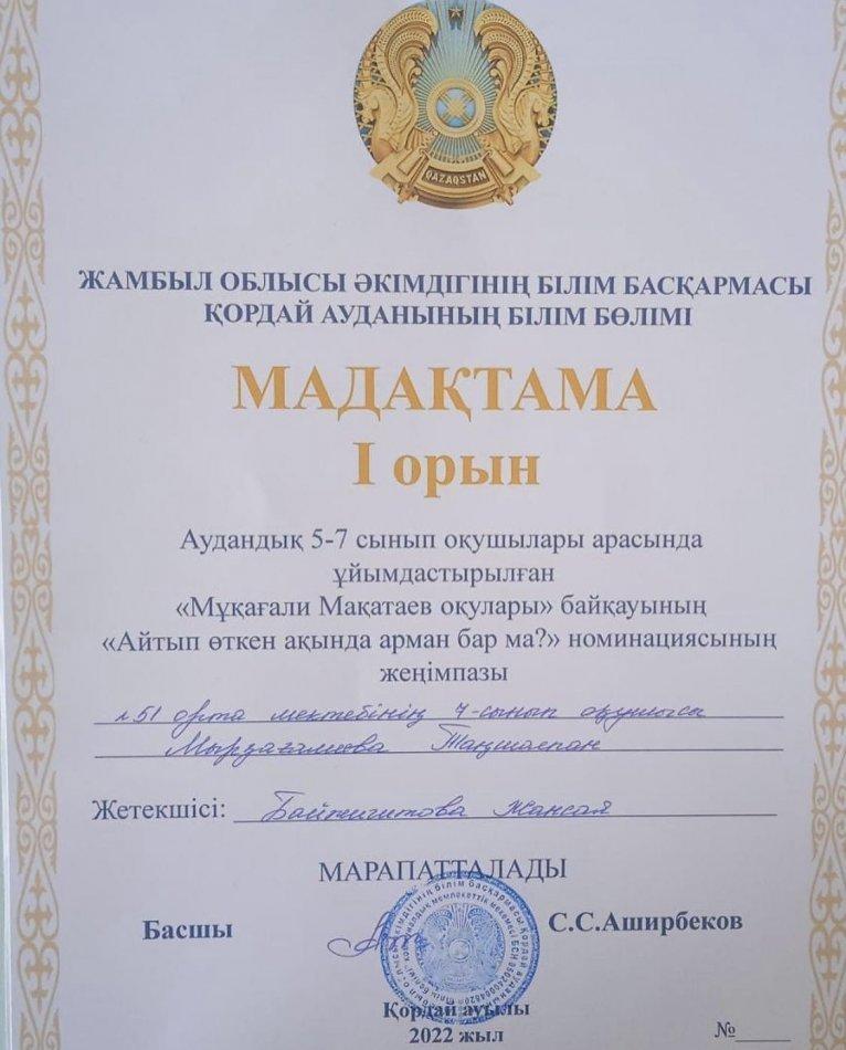 Аудандық 5-7 сынып оқушылары арасында ұйымдастырылған "Мұқағали Мақатаев оқулары" байқауының "Айтып өткен ақында арман бар ма?"номинациясының жеңімпазы №51 орта мектебінің 7 "А" сынып оқушысы Мырзағалиева Таңшолпан І орынды иеленіп, Аудандық білім бөлімі басшысының мадақтамасымен марапатталды. Жетекшісі қазақ тілі мен әдебиеті пәнінің мұғалімі Байджигитова Жансая Асқарқызы.