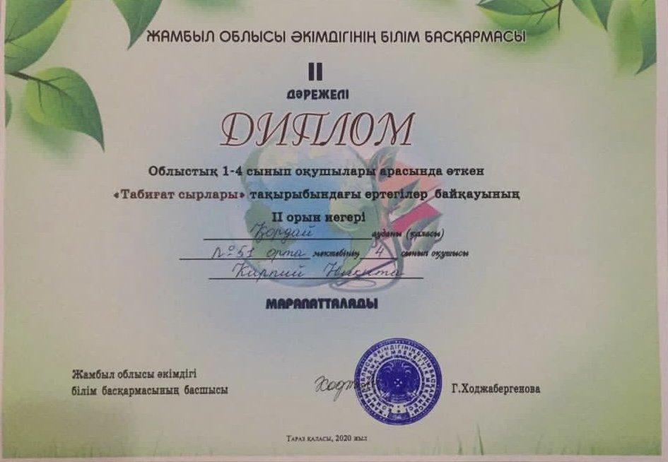 Облыстық 1-4 сынып оқушылары арасында өткен "Табиғат сырлары" тақырыбындағы ертегілер байқауында 4 "Г" сынып оқушысы Карпий Никита ІІ орынды иеленіп, Жамбыл облысы әкімдігінің білім басқармасының дипломымен марапатталды. Сынып жетекшісі - Шолпанкулова А.Е.