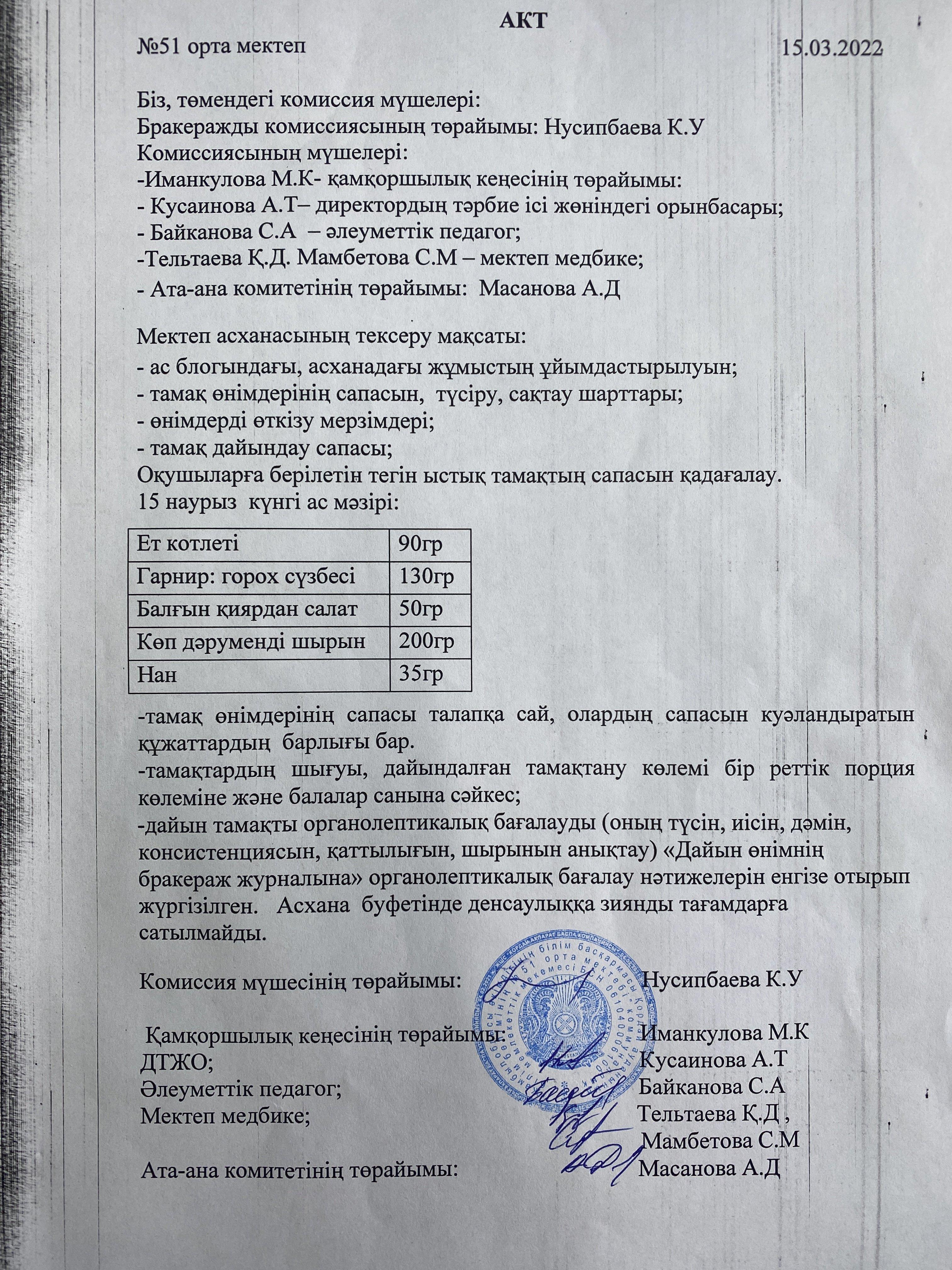 Бракераж комиссиясының мектеп асханасының жұмысын бақылау бойынша АКТ » СШ №51