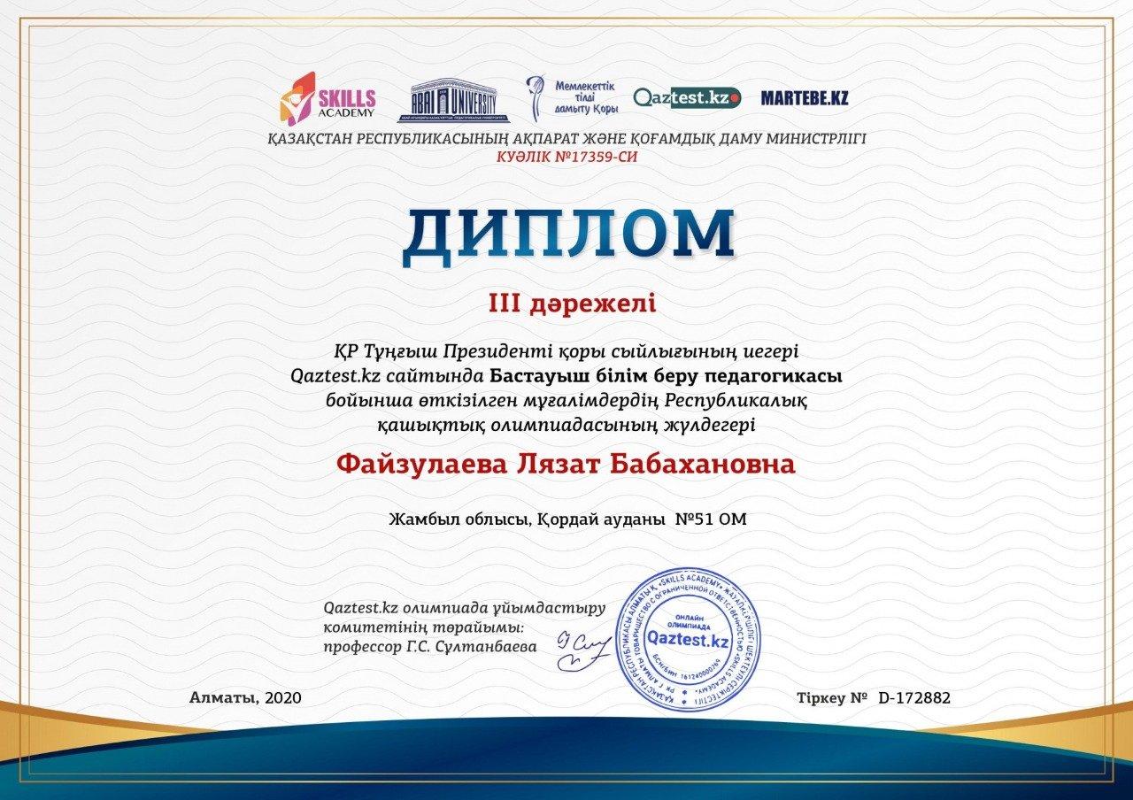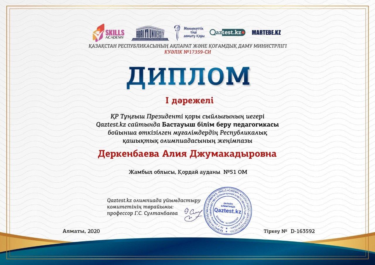 ҚР Тұңғыш Президенті қоры сыйлығының иегері Qaztest.kz сайтында Бастауыш Білім беру педагогикасы бойынша өткізілген мұғалімдердің Республикалық қашықтық олимпиадасының жеңімпаздары: Деркенбаева Алия Джумакадыровна - І дәрежелі дипломмен, Файзулаева Лязат Бабахановна - ІІІ дәрежелі дипломмен марапатталды.
