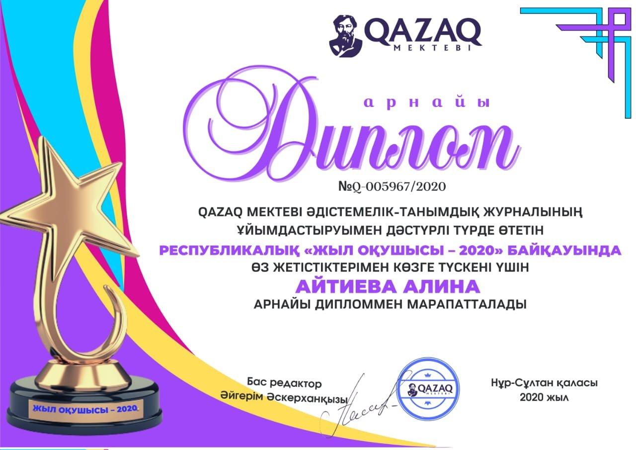 19 январь 2021 0 1 2 3 4 5 "Жыл оқушысы - 2020" - Айтиева Алина! Qazaq mektebi әдістемелік - танымдық журналының ұйымдастыруымен дәстүрлі түрде өтетін Республикалық "Жыл оқушысы - 2020" байқауында өз жетістіктерімен көзге түскені үшін Айтиева Алина арнайы дипломмен марапатталды.