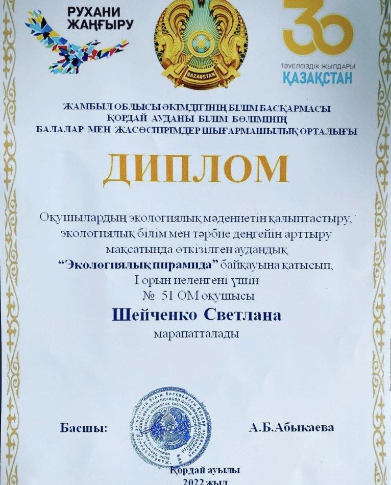 Оқушылардың экологиялық мәдениетін қалыптастыру, экологиялық білім мен тәрбие деңгейін арттыру мақсатында өткізілген аудандық "Экологиялық пирамида" байқауына қатысып, І орын иеленгені үшін №51 орта мектебінің 10 "В" сынып оқушысы Шейченко Светлана дипломмен марапатталды. Жетекшісі биология пәнінің мұғалімі Ибрагимова Амалия Асифовна.